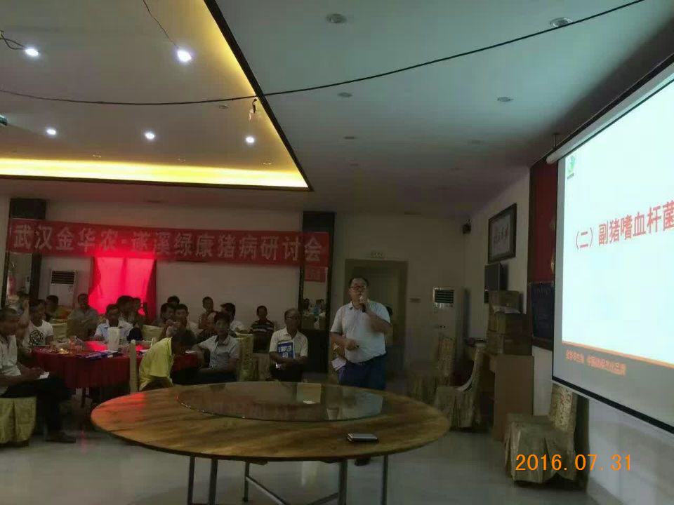 2016年7月12-31日,武漢金華農生物科技有限公司在廣東全省境內成功舉辦6場多形式豬病交流座談會,其中在“揭陽”、“遂溪”兩地成功召開兩場規模化養殖場豬病研討會議。雖然天氣有些炎熱,但絲毫沒有阻擋廣大養殖戶來武漢金華農會場聽課學習的熱情,向華中農業大學豬病專家咨詢交流的決心。公司7月廣東兩場豬病會議召開十分成功,收到良好的效果,達到預期目的。