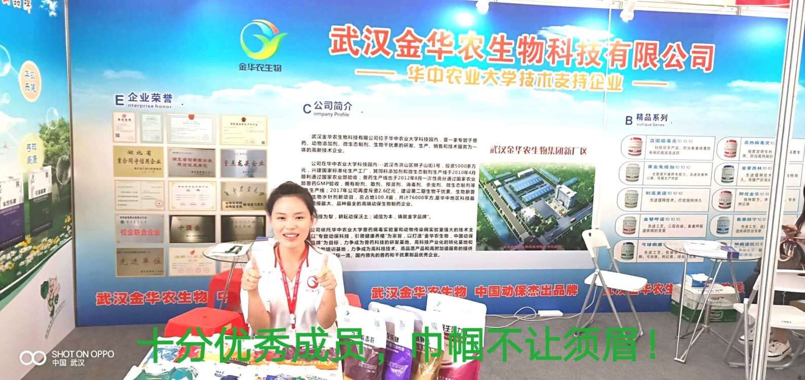 公司領導富勝總經理、常務副總徐巍博士、生產副總黃凡博士、技術總監姚教授、營銷總助郭昌盛導師、人事總助梅寒導師、市場部、企劃部、人事部、招商部等其他部門負責人均參加本次活動。活動期間,華中農業大學校領導、行業主管領導、各界友人和、中外留學生、和校友,紛紛來到武漢金華農集團品牌展示區,參觀考察、友好交流,和洽談各省區代理合作項目,深度對接戰略合作,希望武漢金華農優質獸藥動保產品,以最快最優的速度走向祖國大地,供應服務給每個養殖區域!